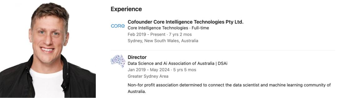 他曾聯合創立Core Intelligence Technologies,並擔任澳大利亞數據科學與AI協會的主管。