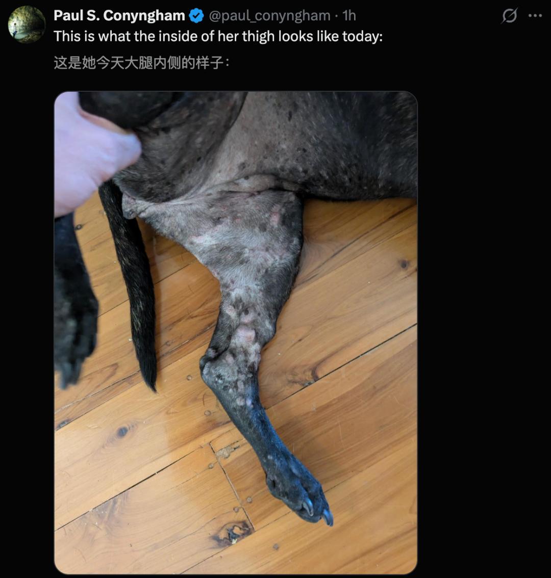 Paul還曬出了愛犬治療前后,腿部的腫瘤從網球般大小,一天天見好的過程。