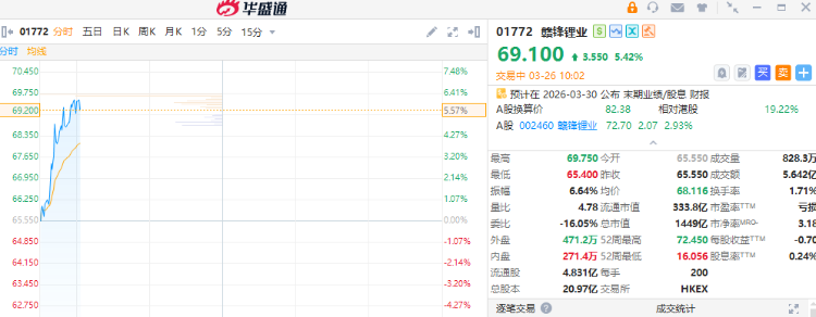 3月26日訊,港股鋰礦股再度活躍,截至發稿,贛鋒鋰業持續拉昇大漲6%,天齊鋰業漲超3%。