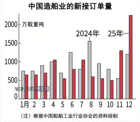 中國造船業新接訂單正快速回暖。2025年,因美國特朗普政府出臺針對中國船舶的管制措施,行業一度陷入苦戰,但隨着該措施宣佈延期,到2025年底訂單量隨之回升。在液化天然氣(LNG)運輸船等高附加值船舶領域,中國造船業的影響力也在不斷提升,彰顯出全球市場份額第一的雄厚實力。