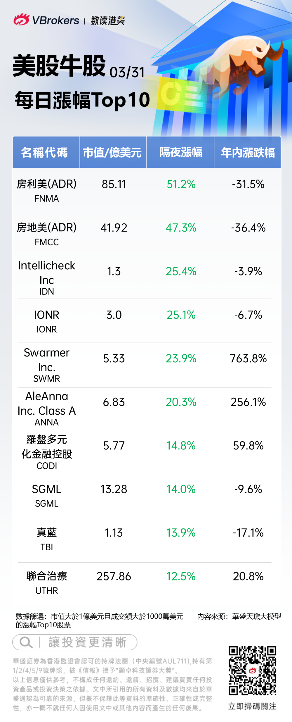 發仔梳理了每日美股漲幅Top10榜單,供投資者參考。以下為隔夜美股漲幅靠前的個股: