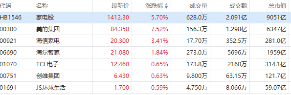 港股家電股集體走高,美的集團績后大漲超7%,現報83.35港元,消息面上,公司2025年股東應占溢利439.45億元,同比增長14%,海外OBM佔比超45%驅動業績增長;海信家電漲超3%、海爾智家漲近2%,TCL電子、創維集團跟漲。