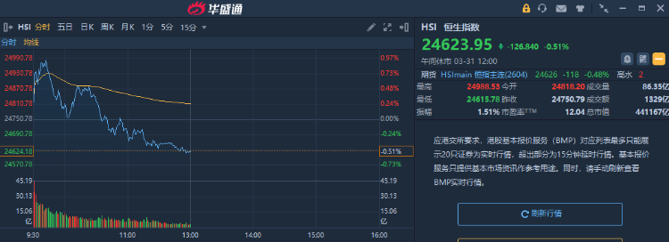 3月31日消息,港股三大指數集體下跌。截至午間收盤,恆生指數跌0.51%,報24623.95,恆生科技指數跌0.94%,國企指數跌0.83%。盤面上,科網股集體下跌,小米、嗶哩嗶哩跌超2%,阿里巴巴、聯想跌超1%;煤炭股跌幅居前,中煤能源跌超7%;石油股普跌,中石油跌超4%;新消費概念股走弱,泡泡瑪特跌近5%;今日兩隻新股上市,傅里葉漲超101%,銅師傅跌超37%。