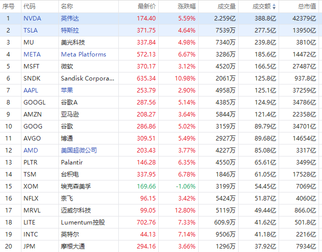 第3名美光收高4.93%,部分挽回了周一蒙受的跌幅,成交236.75億美元。花旗以DDR5 DRAM現貨價格近期明顯走軟為由,將美光科技目標價大幅下調17%,但維持買入評級及全部盈利預測不變,認為AI驅動的存儲需求長期邏輯未受根本動搖。