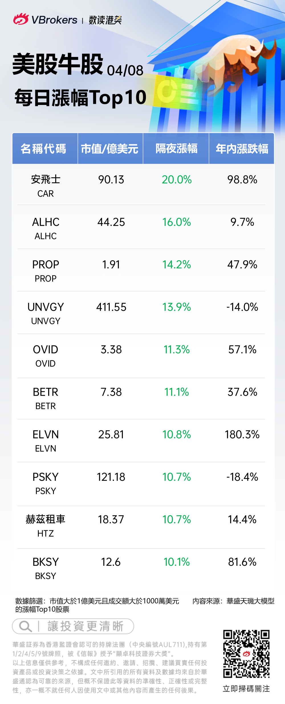 發仔梳理了每日美股漲幅Top10榜單,供投資者參考。以下為隔夜美股漲幅靠前的個股:
