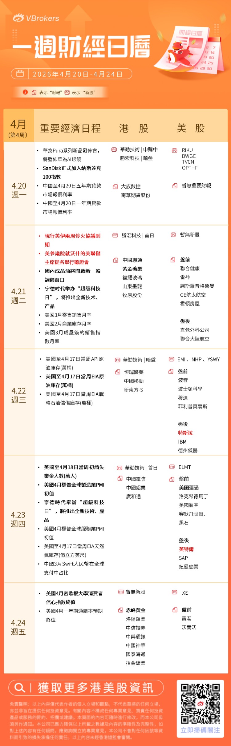 港股方面 周一(4.20):華勤技術 | 申購中 ;勝宏科技 | 暗盤 周二(4.21):勝宏科技 | 首日 周三(4.22):華勤技術 | 暗盤 周四(4.23):華勤技術 | 首日 |