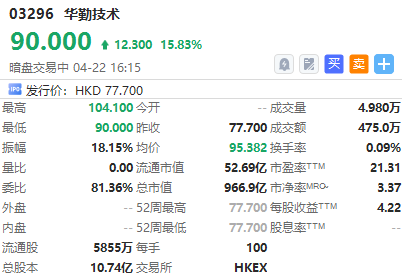 華盛資訊4月22日訊,「消費電子ODM龍頭」華勤技術正在港股暗盤交易中。截至發稿,漲近16%,中籤一手賬面浮盈1230港元,最新總市值超966億港元。