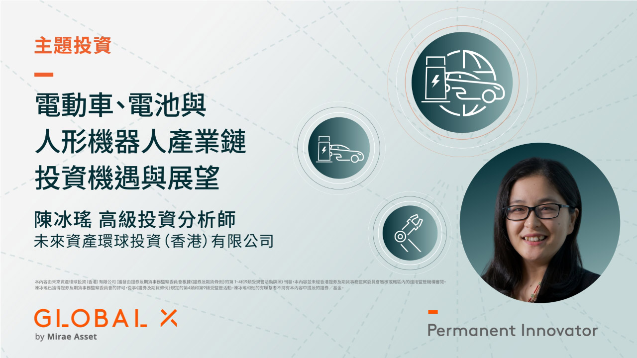講師 陳冰瑤 高級投資分析師 未來資產環球投資(香港)有限公司 直播要點 1. AI及傳感器等技術的進步,如何在應用領域使用 2. 相關投資產品如何將重點擴展到更具協同效應的融合領域 3. ETF產品策略調整如何更好捕捉成長機會