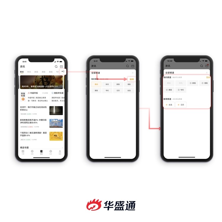 点击按钮,即可编辑我的频道。请注意,华盛通一开始默认勾选了全部频道,您可以通过点击按钮上的“-”号移除不想要的栏目,点击下方按钮上的“+”号添加需要的栏目,完成编辑后点击“完成”按钮,即可。