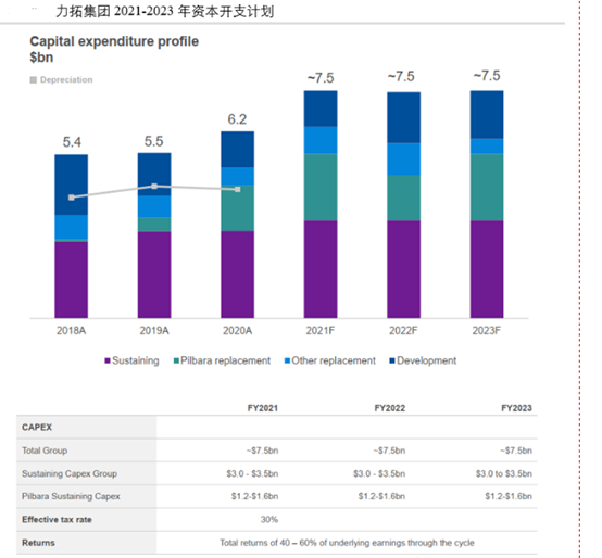根據力拓2020年業績報告的描述,2020年整體力拓集團的資本開支總量為62億美元,同比增長13%,預計2021年資本開支將達到75億美元,並且2022-2023年也將保持75億美元的資本支出強度。