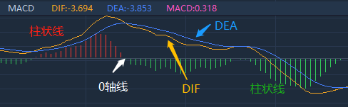 一条快线(DIF)、一条慢线 (DEA)、一条0轴线和若干红绿柱状线组成。