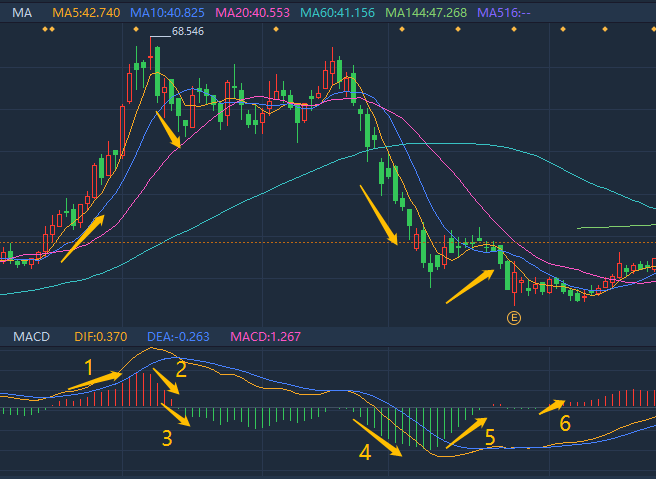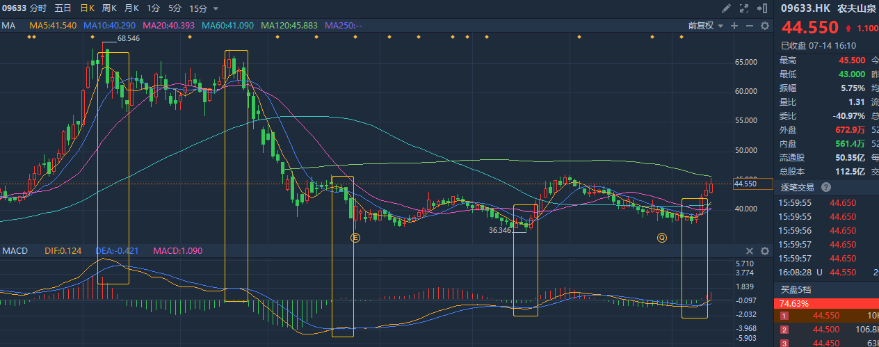 我们来观察一下农夫山泉股票价格走势图,发现在MACD指标体系中,黄线和蓝线交叉的位置大多数都是股票最佳的买入(或卖出点)