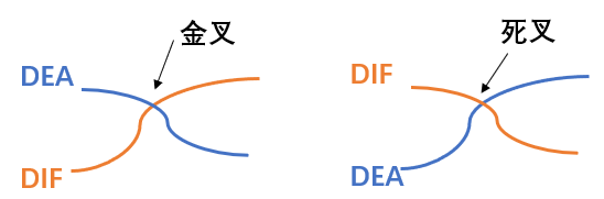 当DIF(黄线)向上突破DEA(蓝线),为买入信号,俗称“金叉“