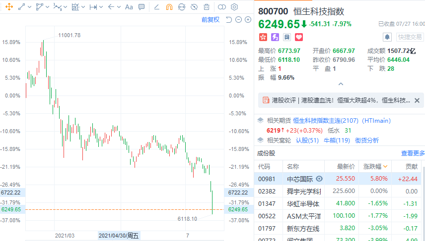 港股以大型科网股的大跌引发蔓延至全市场,致行业板块全线重挫,市场情绪极度低迷。截至收盘,恒生科技指数跌7.97%报6249点盘中创历史新低,跌幅一度逼近10%为历史首次。