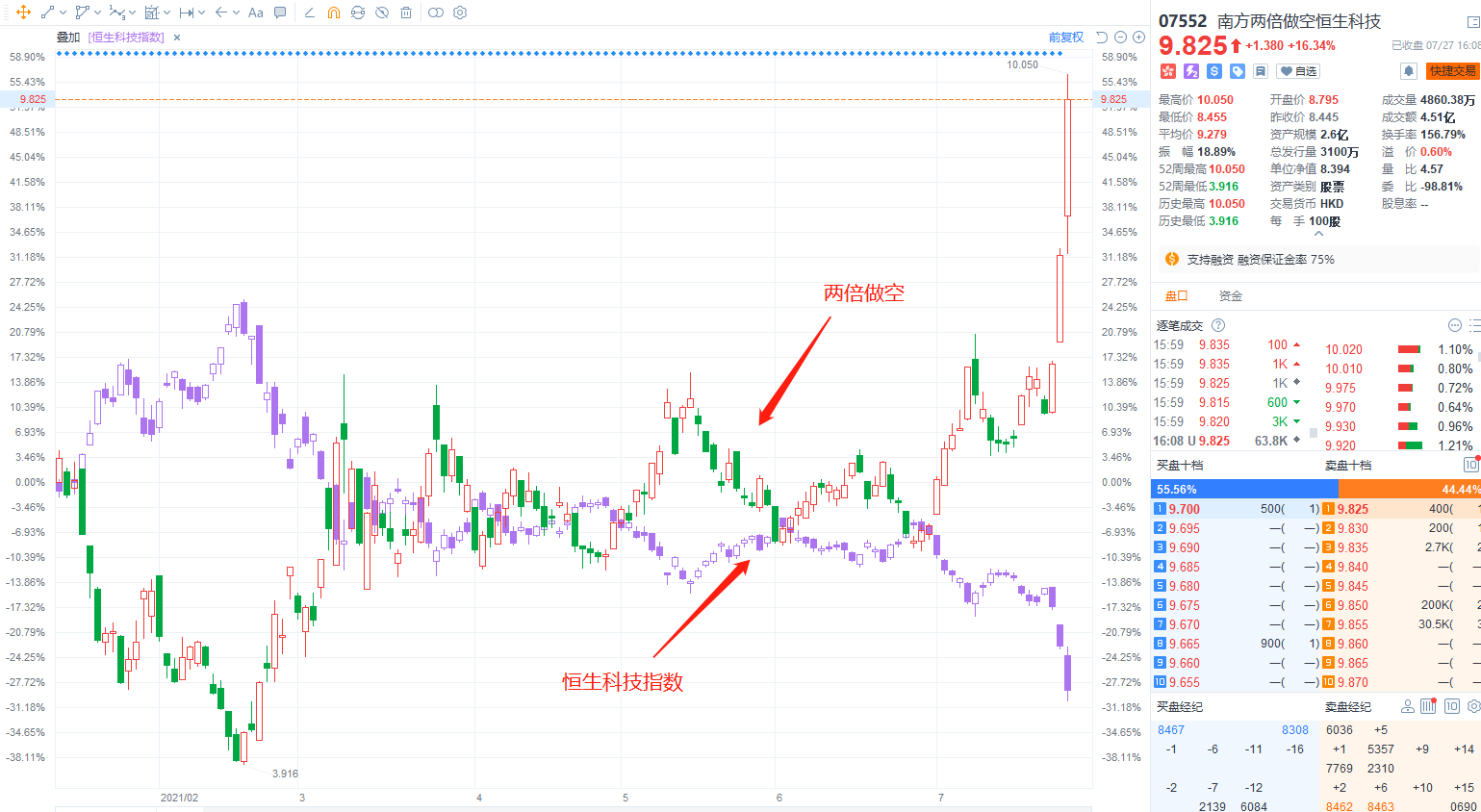 今天,恒生科技指数历史性暴跌,像昨天咱们提到的二倍做空恒生科技指数(07552.HK)就逆势上涨了16.34%。如果说昨天看了文章,做日内交易的投资者今天能够小赚一笔了。
