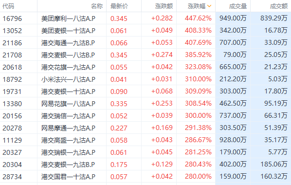 今日轮证涨幅居前的包括:美团摩利一八沽A暴涨447.62%,占据排行榜第一,美团麦银一十沽A涨408.33%;港交海通一九沽B涨407.69%。截至收盘,美团下跌17.66%,今日共有21只沽证涨超100%。