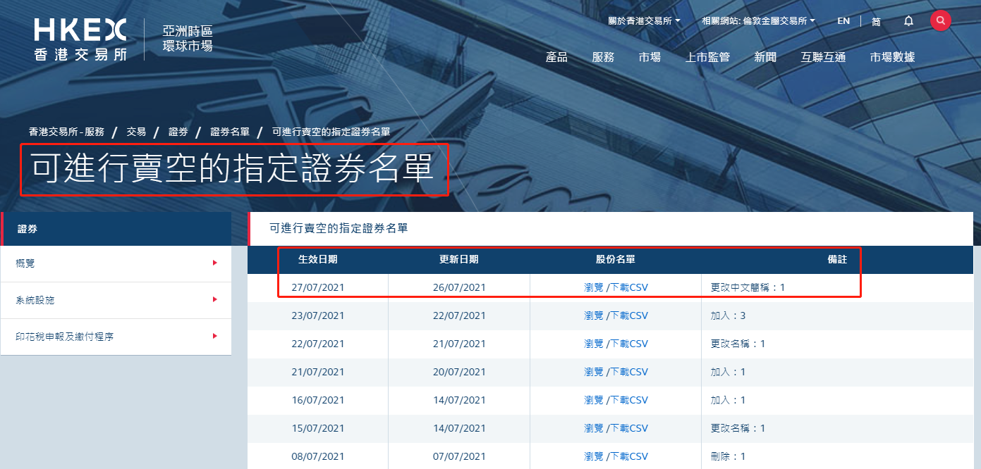 打开下方链接,按照顺序依次点击:香港交易所→服务→概览→受监管的卖空活动→浏览