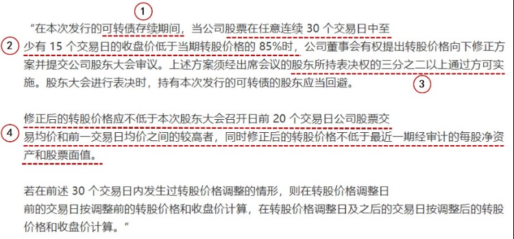 前面我们说过,强赎条款我们通常简写成“15/30,130%”。同理,下修条款我们也会简写成“15/30,85%”,即表示30天里只要有15天低于转股价85%就触发下修。