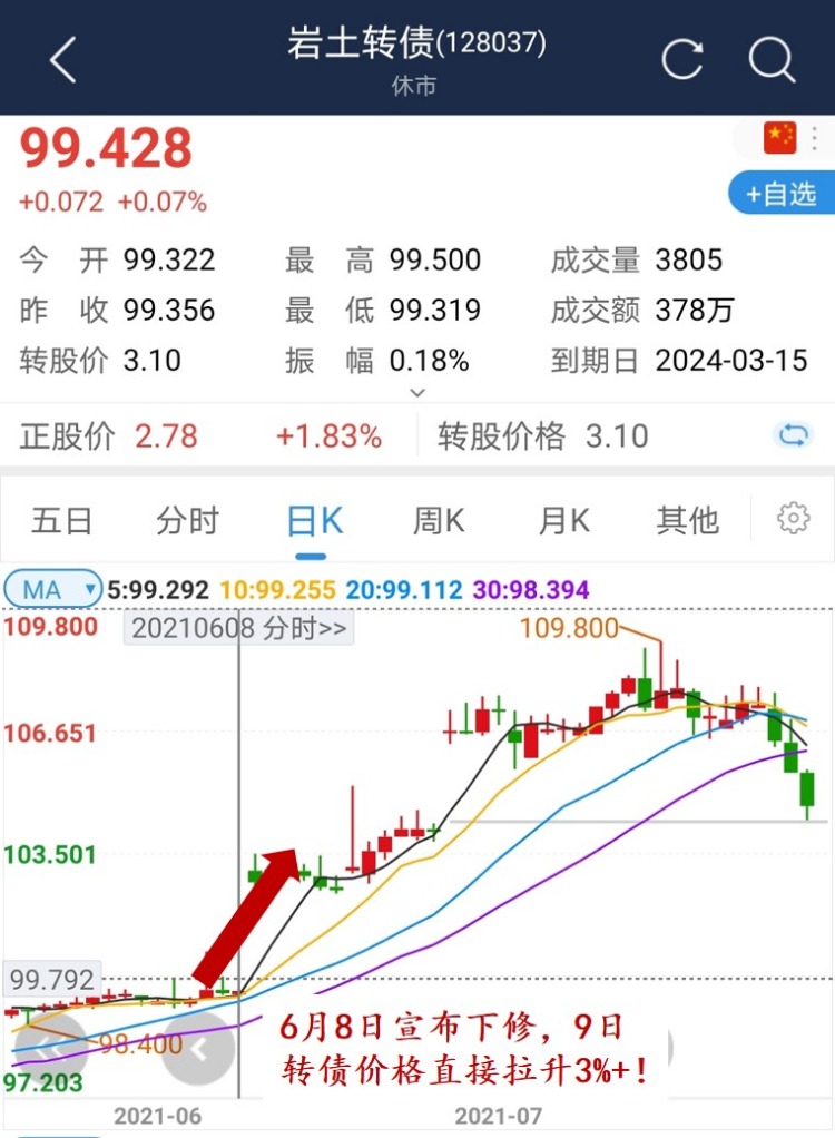 不信你看岩土转债,6月8日董事会提出下修预案,虽然股东大会还没开,还不知道会不会通过,但9日转债价格就直接被拉升了3%+!