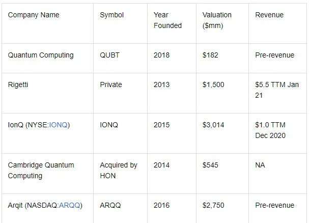 在上表中提到的四家公司中(除了QUBT), $ARQIT QUANTUM INC ARQQ$ 和 $IonQ, Inc. Common Stock IONQ$ 是上市公司。剑桥量子计算将与霍尼韦尔量子解决方案合并,霍尼韦尔量子解决方案是从霍尼韦尔国际(纳斯达克代码:HON)剥离出来的实体,该公司对剑桥的估值约为5.45亿美元。另一家私营企业Rigetti Computing宣布,将通过与Supernova Partners的SPAC交易上市,该公司的估值将达到15亿美元。