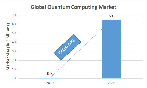 2019年全球量子计算市场规模为5亿美元,预计从2019年起将以56%的复合年增长率(CAGR)增长,到2030年达到约650亿美元的市场价值。