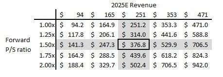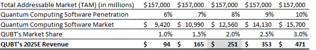 上表描述了公司基于市场份额渗透和获取所能达到的2025E收入。假设量子计算软件的市场渗透率为8%,市场份额为2%,那么该公司2025E的营收为2.5亿美元。