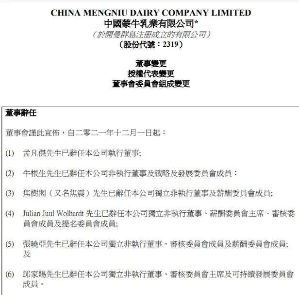 11月30日深夜,蒙牛乳业(02319.HK)发布公告称,董事会进行了一系列董事变更,宣布自12月1日起,公司董事会共6名董事辞任。