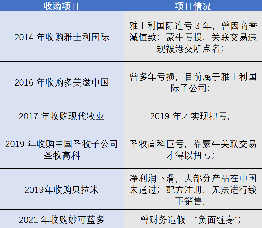 数据显示,2014年收购的雅士利国际、16年收购多美滋中国、17年收购的现代牧业、19年收购的圣牧高科和贝拉米都经历过较长的亏损期;20年收购的妙可蓝多,自爆财务造假、“负面缠身“,屡次收到上交所问询函。