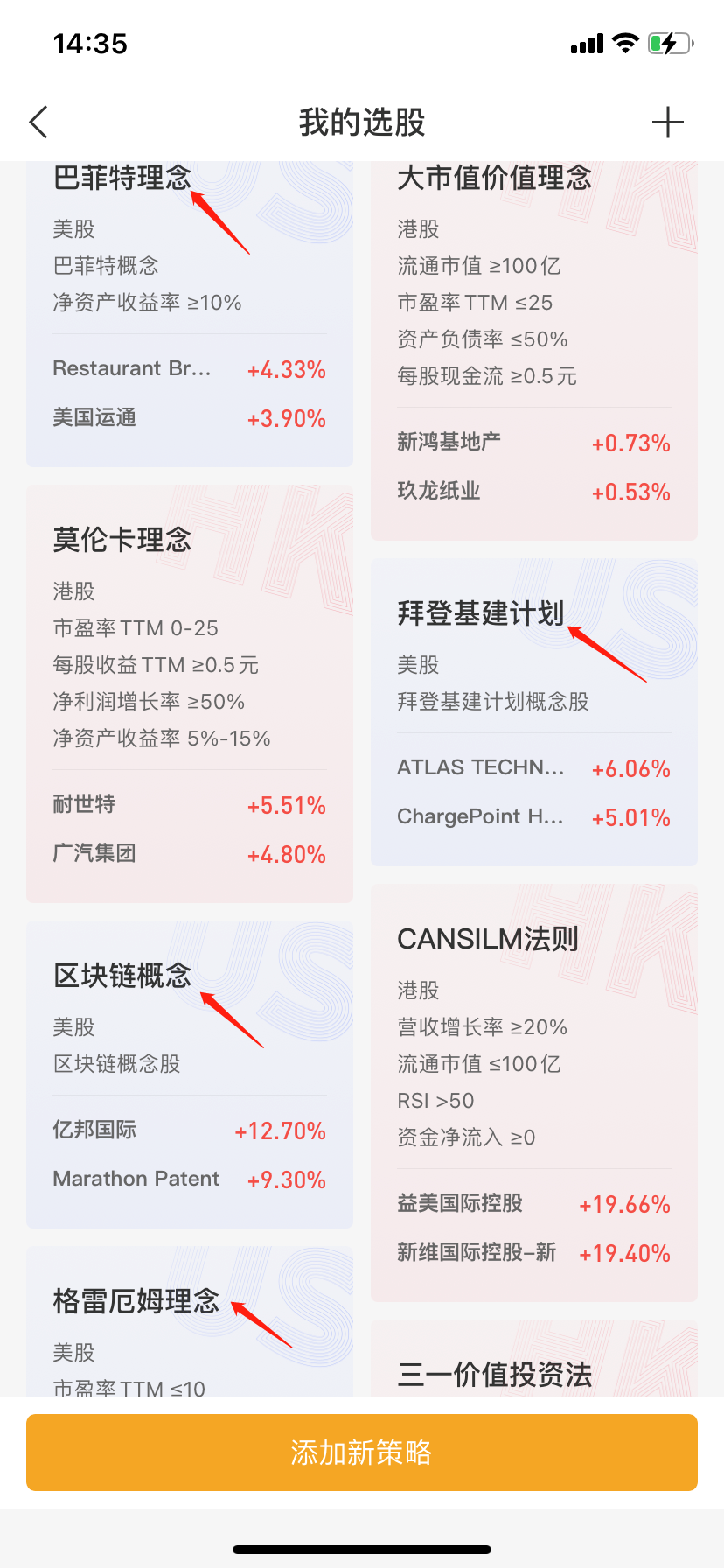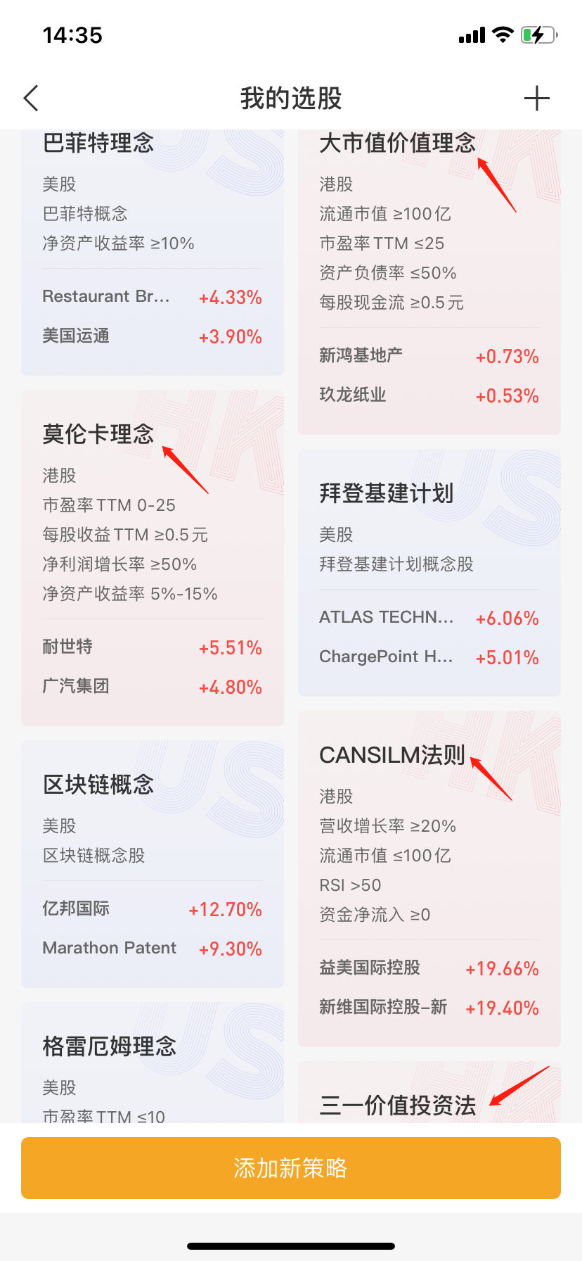 从不同维度对整个市场上的股票进行筛选,比如市场、行情、基本面、技术面,还可以根据自己的想法选择指标,并以选股策略形式记录下来,方便下次快速查看。