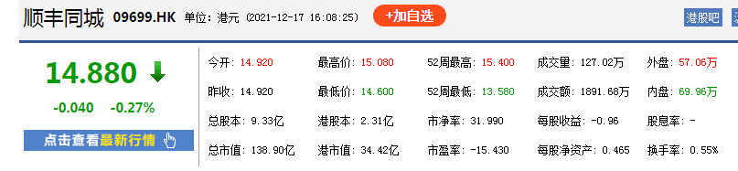 但顺丰同城并未获得资本的认可,上市发行价为16.42港元/股,但首日即遭破发,盘中一度跌逾15%,最后报收14.9港元,跌幅为9.26%,市值为139亿港元,截至12月21日股价继续走低,为15.44港元/股,总市值为144.13亿港元。