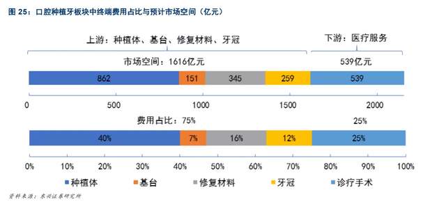 拆解种植牙产业链的终端费用环节,产业链上游费用占比最大,去到75%,这其中种植体费用占比为40%,修复材料费用占比16%,下游的诊疗手术费用占比 25%,预测上游市场空间约1616亿元,下游诊疗服务市场空间为539亿元。