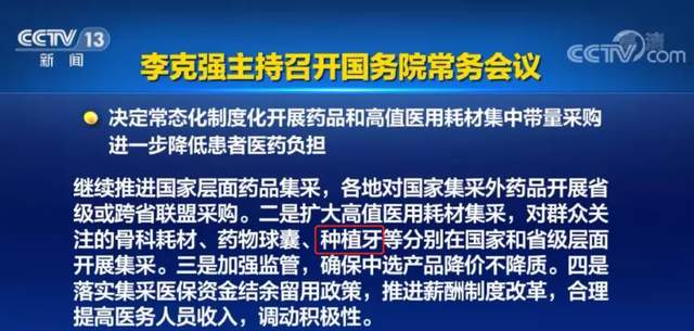 2022年1月10日,国常务会决定常态化制度化开展药品和高值医用耗材集中带量采购,进一步降低患者医药负担。逐步扩大高值医用耗材集采覆盖面,对群众关注的骨科耗材、药物球囊、种植牙等分别在国家和省级层面开展集采。