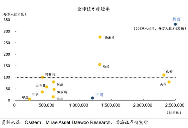 韩国是一个很好的例子,其种植牙因为纳入医保渗透率上升迅猛,达到每万人632颗,为全球最高,而中国每万人种植牙数量仅28颗,如果未来能达到一般发达国家水平,有巨大的上升空间。