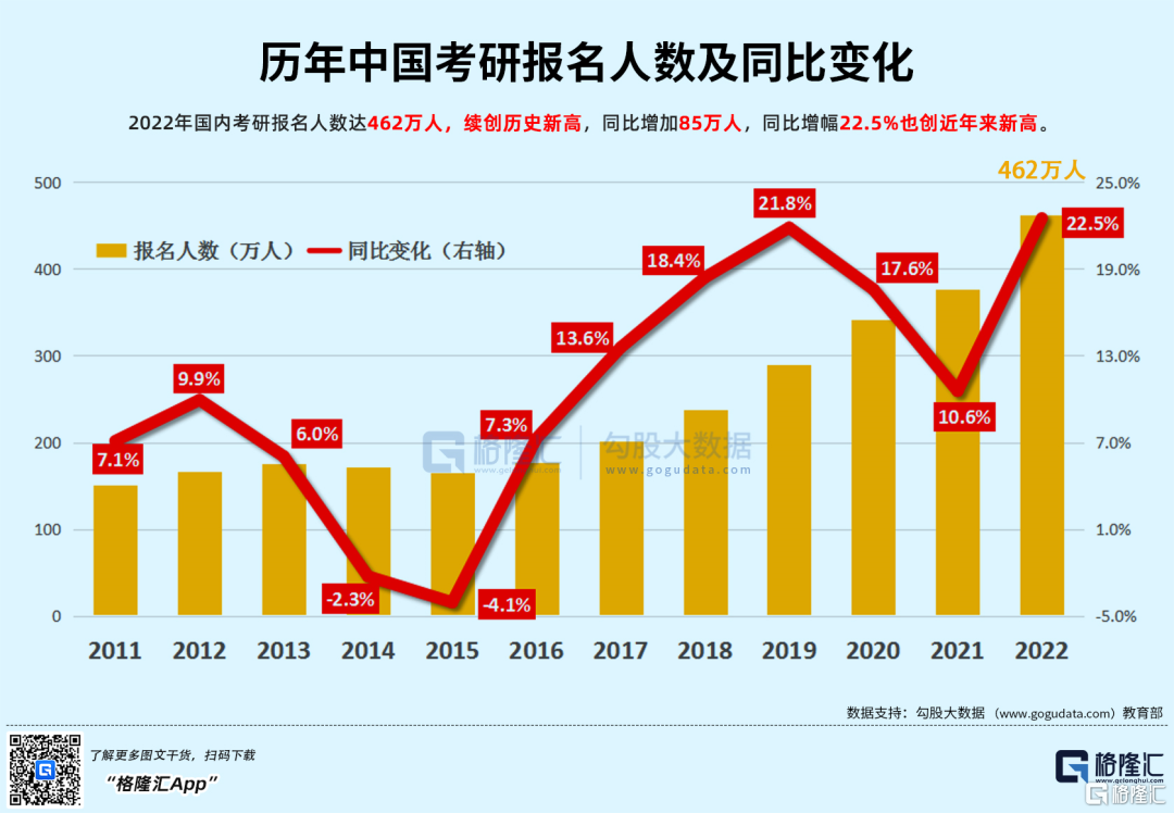 也可以通过青年受教育年限增加从而推迟结婚来解释。2022年国内研究生报名人数增加22.5%,达到了历史新高的462万人。