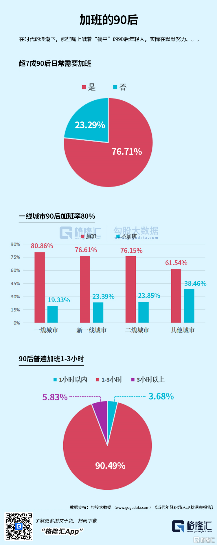 在猎聘网2021年9月公布的《当代年轻职场人现状洞察报告》中,76.71%的“90后”职场人日常经常加班。就加班时长来看,“90后”职场人加班时长在“1-3小时”的占比超9成。