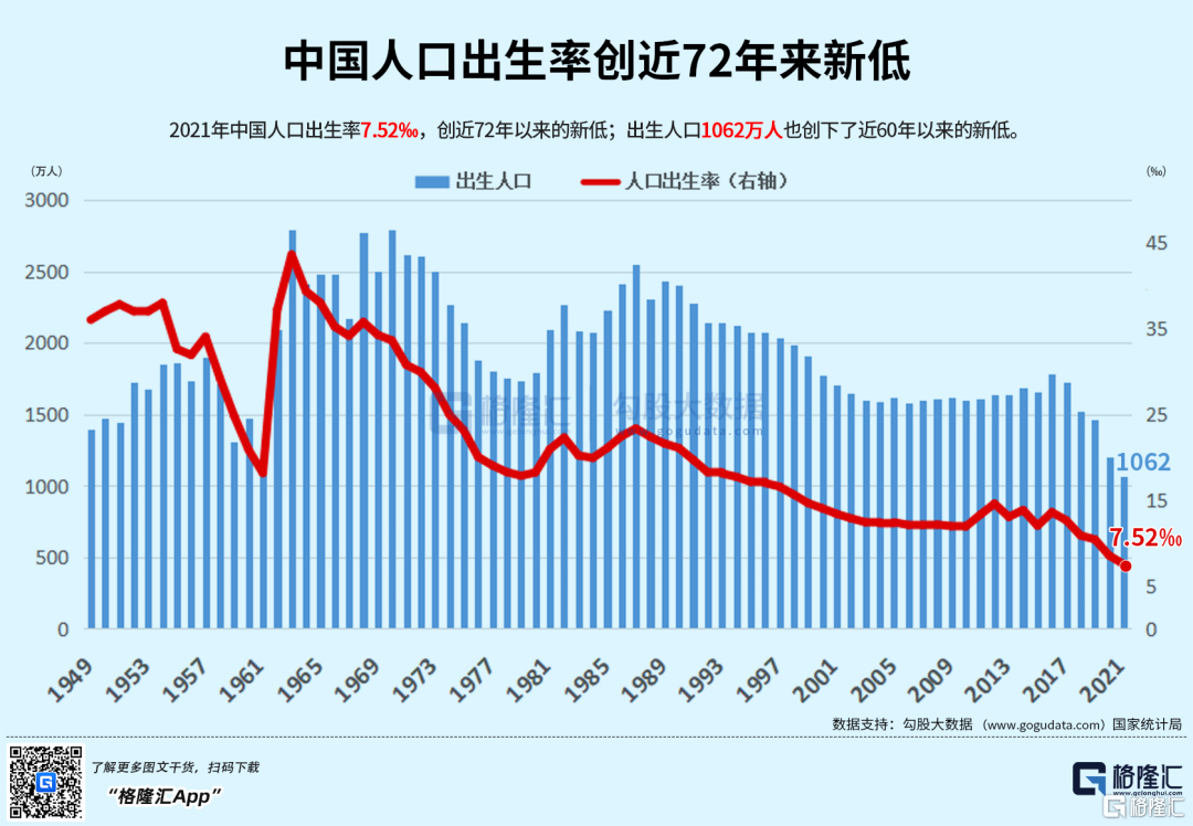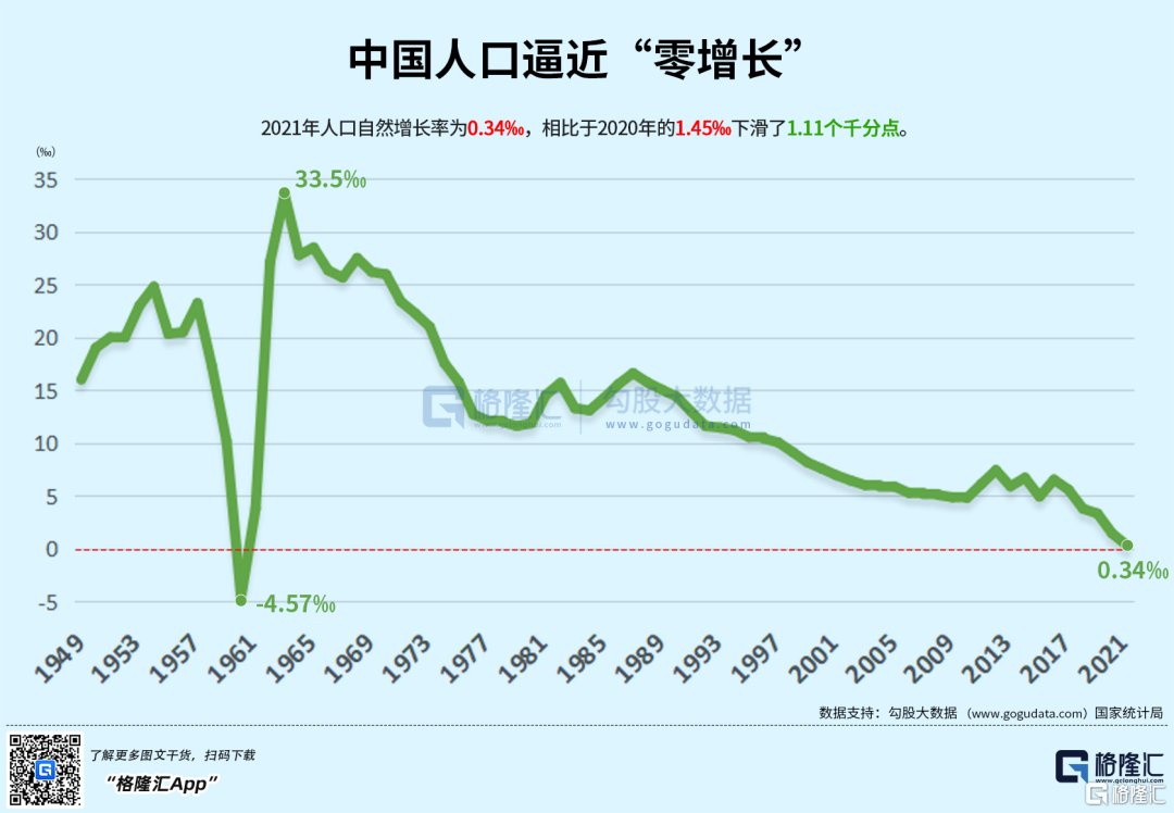 忧虑的是,2021年中国人口自然增长率仅0.34‰,逼近零增长。人口出生率和人口出生数分别创下了近72年与近60年以来的新低。