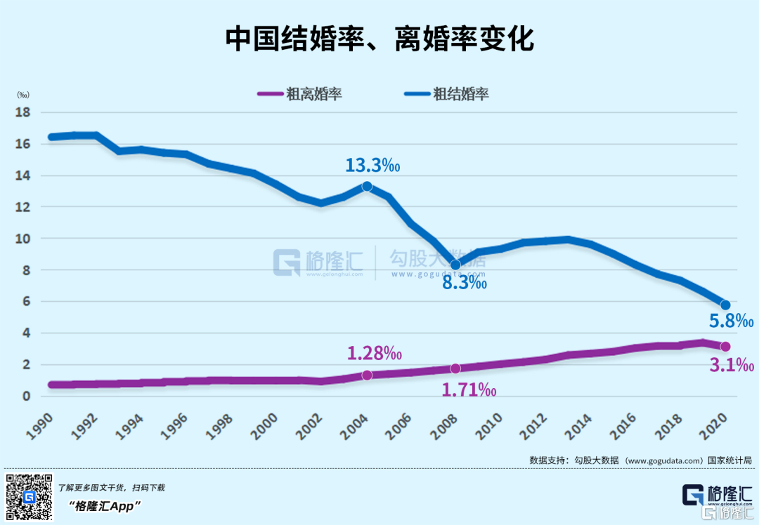 根据民政局公布的数据,截至2020年,中国的结婚率已经连续7年下滑,降至5.8‰,并且与下滑的结婚率完全相反的是,中国的离婚率节节攀升,已经到达了3‰。