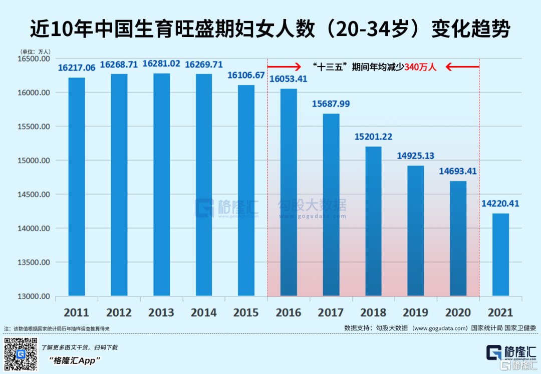 根据国家卫健委公布数据,“十三五”时期,中国20岁至34岁生育旺盛期妇女年均减少340万,2021年相比2020年减少了473万。