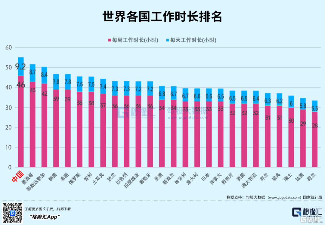 根据OECD(经合组织)的数据统计,中国成为了全世界最“勤劳”的国家,以每天9.2小时的成绩高居工作时长排名的榜首。