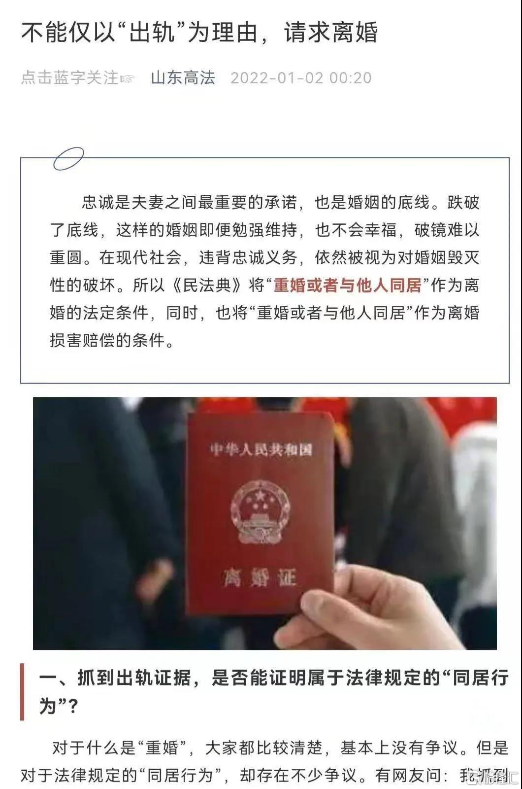 2022年1月2日,一篇由山东高级人民法院公众号出品,名为《不能仅以“出轨”为理由,请求离婚》的文章让人啼笑皆非。