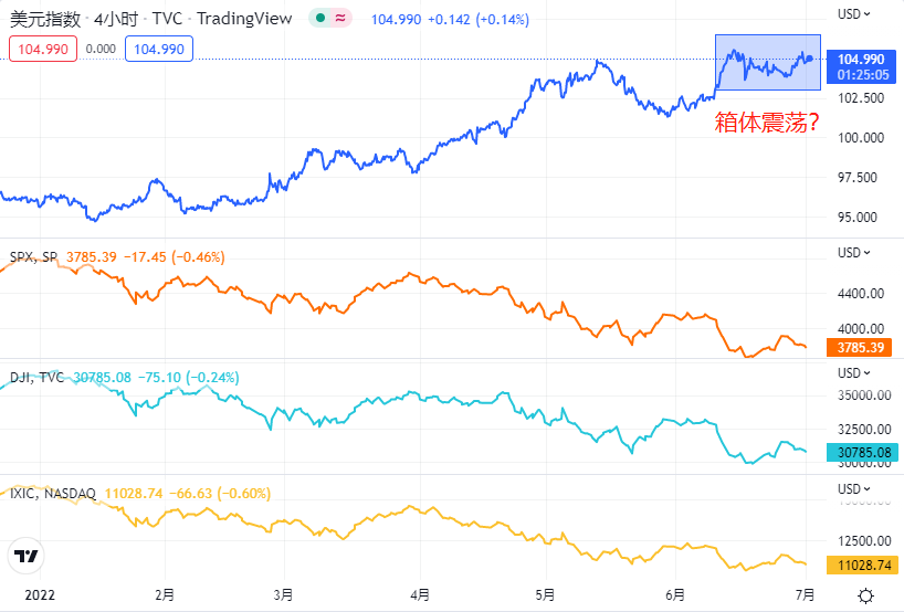 考虑到7月份加息预期的上升空间有限, $美元指数主连 DXMAIN$ 或难以就此突破105.5关口,是否存在顶部强压?若7月保持这种震荡走势?有什么期权适合做对冲么?