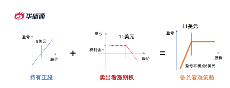 于是你卖出一张某到期日的看涨期权,行权价11,权利金为2美元/股*100股=200美元,此时组合盈亏平衡点=正股买入价-权利金=8-2=6美元。