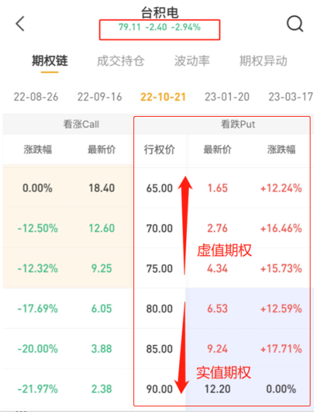 以 $台积电 TSM$ 22-10-21到期日的期权为例