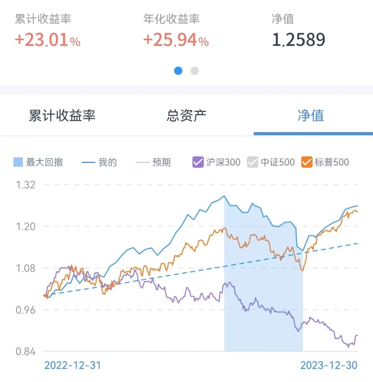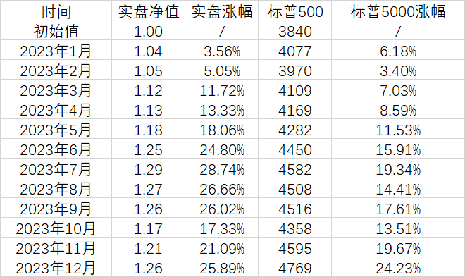 以2023年1月1日为初始值,净值为1,截止12月末,年内标普 500 指数上涨 24.23%,我的实盘上涨 25.89%。